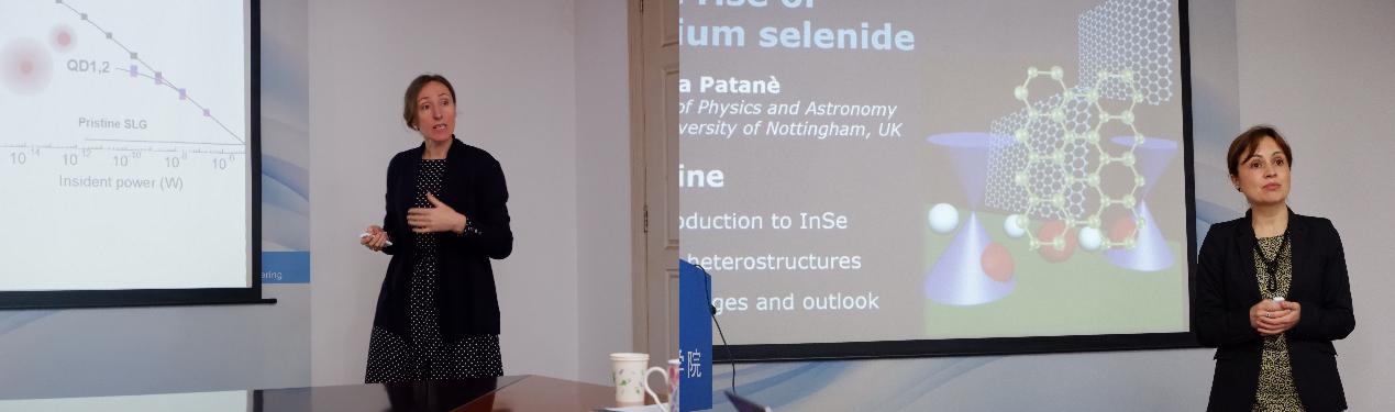 随后Lyudmila Turyanska副教授作了题为“Functional low dimensional materials”的报告,她是一位跨学科研究的材料科学家,专注于新型功能性低维材料的开发和研究,取得了很多学术荣誉。在报告中,她主要介绍了结合具有不同维度纳米结构的混合材料的工作,包括基于高性能石墨烯的器件,利用石墨烯的独特电子特性并与其他材料或纳米结构组合实现附加功能。在用PbS量子点修饰的石墨烯器件中实现了高达109 AW-1的光响应性,展示了表面修饰的纳米材料对电子及光电子学的重要应用价值。
