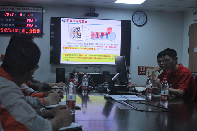 实践团队深入海上平台一线岗位,将科学技术作为第一生产力,促进新技术落地,以实际行动加快践行海洋强国战略,坚持“把论文写在祖国的大地上”。团队基于生产废水排放不达标的问题,在学院副院长杨强老师的指导下,进行了单纤维流动捕获、亲疏水组合纤维破乳除油、成套技术装备的构建等系统研究和调研,致力于解决困扰我国海洋开采废水处理中的重要难题。