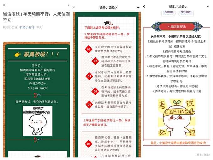 同时,为了进一步营造良好的考前氛围,学院发布了诚信考试的专题推送,帮助同学们顺利度过接下来的考试阶段。