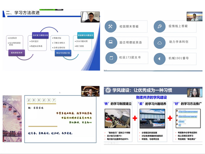 在学习经验分享展示环节,学习进步优秀个人获奖代表、2018级弭禹彤分享了自己通过“提高课堂效率、及时复习课程内容、制定可实现的学习计划、探索解决问题途径”的方式不断改进学习方法,实现年级排名由第120名提升到第2名、获得校飞扬进步奖学金的经历;学风建设优秀个人获奖代表、2017级吴家盛分享了自己在学好专业知识的同时,作为班级团支书、机械类1901班的督导、学院“学业帮扶中心”授课小老师、校“励志明德班”英语授课老师,积极参与学校、学院、班级学风建设的过程;学风建设优秀寝室获奖代表、2016级孙高亮从寝室文化建设入手,介绍了他们通过制定严格的寝室规则,开展“制定计划-同步复习-相互讲题-互相抽查”的学习活动,实现寝室获奖学金率100%,3人保研、1人签约世界500强企业的故事,寝室相关事迹也曾被小花梨专题报道;学风建设优秀班级获奖代表、机设172班团支书王妍从班团建设讲起,他们通过建立“铁”的学习制度、培养“柔”的学习兴趣、推广“好”的学习方法,在班导师高阳教授的带领下,在班级建设和学风建设方面取得了一系列成绩,荣获校十佳班集体和十佳团支部称号。
