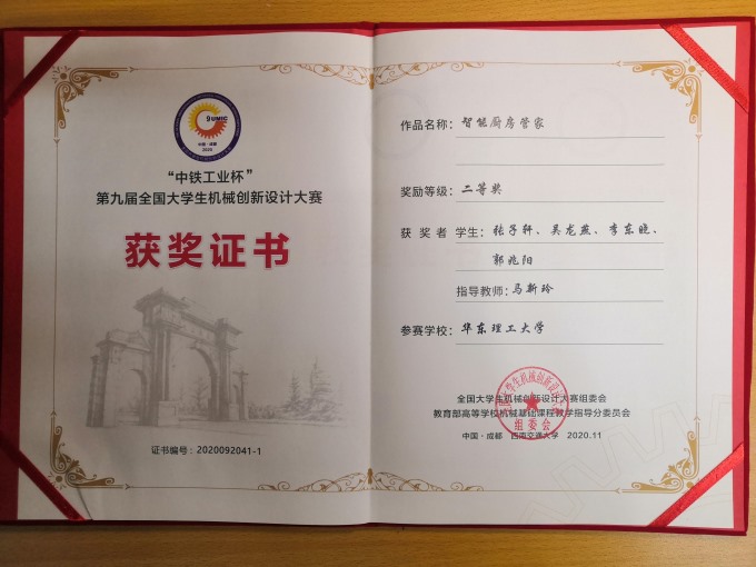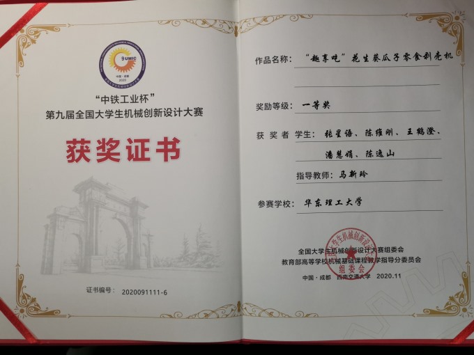 2020年11月20日至22日,第九届全国大学生机械创新设计大赛决赛在四川成都西南交通大学举行。本届大赛主题为“智慧家居,幸福家庭”,来自全国30个省(直辖市、自治区)678所高校的十余万大学生参赛。我校yl88858cc永利官网马新玲老师指导的作品《“趣享吃”花生葵瓜子零食剥壳机》获得全国一等奖;作品《智能厨房管家》获得全国二等奖。这是华理学子从2004年首届国赛参赛以来第三次闯入决赛、第二次获得全国一等奖。