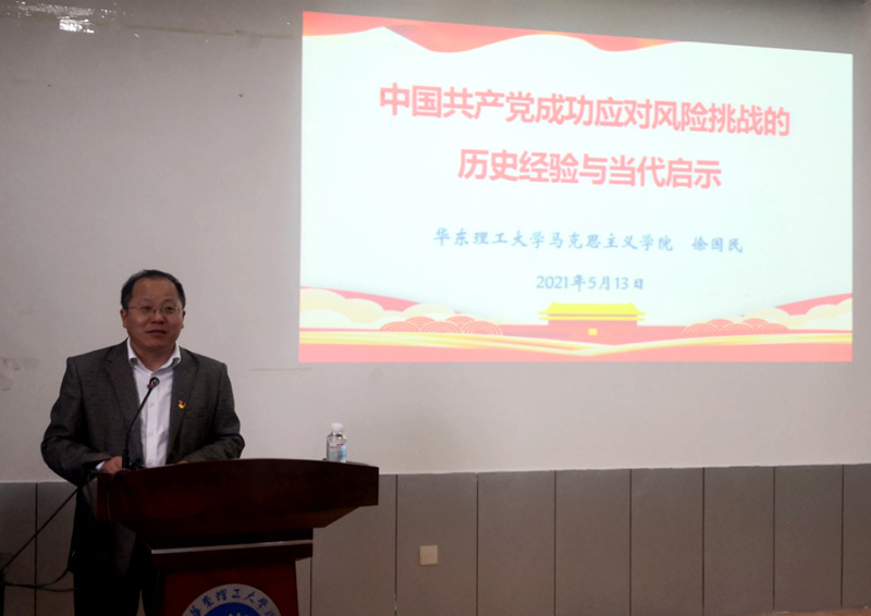 为深入学习贯彻习近平总书记在党史学习教育动员大会上的重要讲话精神,高质量开展党史学习教育,5月13日下午,上海市委宣讲团党史宣讲团专家组成员、我校马克思主义学院副院长徐国民教授受邀作了题为“中国共产党成功应对风险挑战的历史经验与当代启示”专题辅导报告,yl88858cc永利官网全体教职工参加。报告会由yl88858cc永利官网党委书记杨强主持。