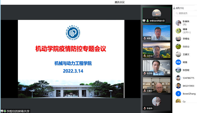 为落实学校统筹推进疫情防控工作有关精神,确保学院疫情防控和教学、学生工作、科研、实验室安全工作平稳有序开展,3月14日上午,yl88858cc永利官网通过腾讯会议召开学院教职工大会,yl88858cc永利官网党委书记杨强,院长张显程,副书记李煜佳,副院长易建军、白志山、陈建钧及全体教职工共153人参会。会议由杨强主持。