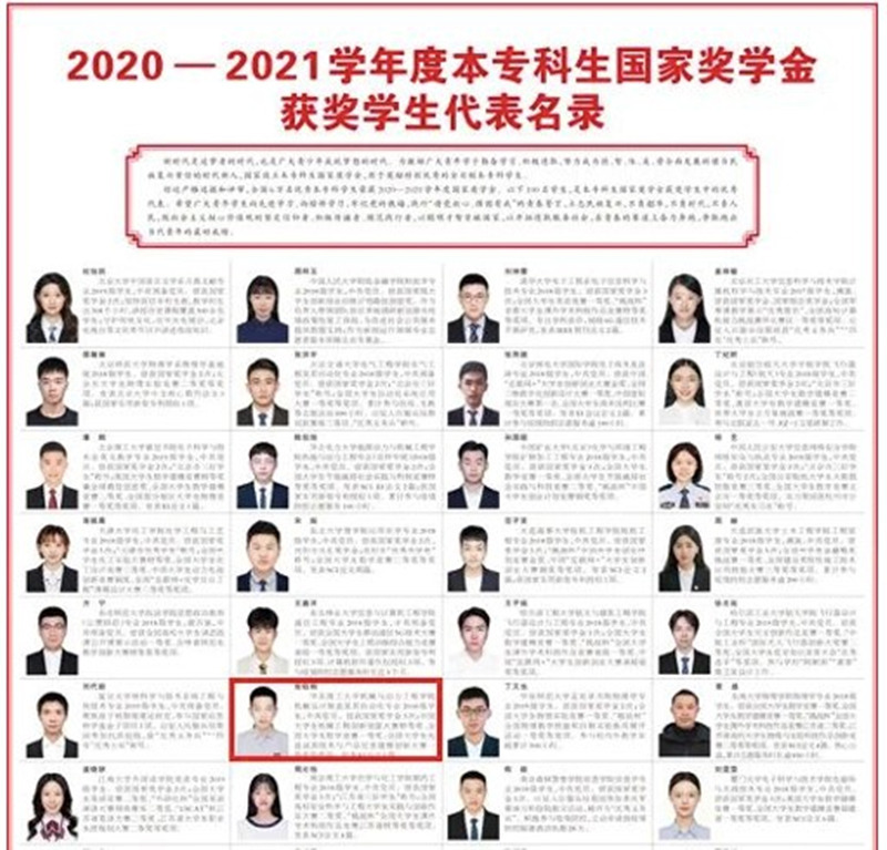 5月4日,《人民日报》刊登《2020-2021学年度本专科生国家奖学金获奖学生代表名录》,我校yl88858cc永利官网机械设计制造及其自动化专业2018级本科生张钰炯从6万名本专科国家奖学金获奖学生中脱颖而出,作为全国100名优秀学生代表荣登该名录。