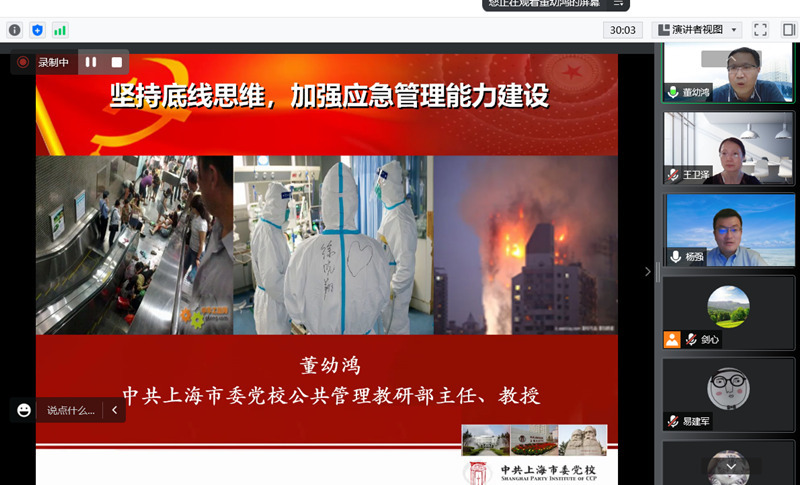 为进一步深入学习贯彻习近平总书记关于安全生产重要论述,强化理论武装,6月21日晚上,yl88858cc永利官网邀请中共上海市委党校(上海行政学院)公共管理教研部主任、上海市委党校应急管理培训中心主任董幼鸿教授作题为“坚持底线思维,加强应急管理能力建设”的辅导报告,学院全体教师通过腾讯会议参加学习。报告会由学院党委宣传委员王卫泽主持。