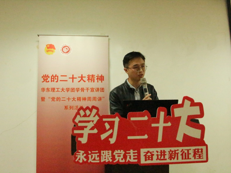 11月22日下午,由校团委主办,yl88858cc永利官网团委承办的党的二十大团学骨干宣讲团“党的二十大精神周周讲”系列首场宣讲活动在奉贤校区大活215举行。2019年度“中国大学生自强之星”、2020上海大学生年度人物获得者、yl88858cc永利官网博士后刘懿谦做了主题为“服务海洋强国战略 把论文写在蓝色国土上”的宣讲。