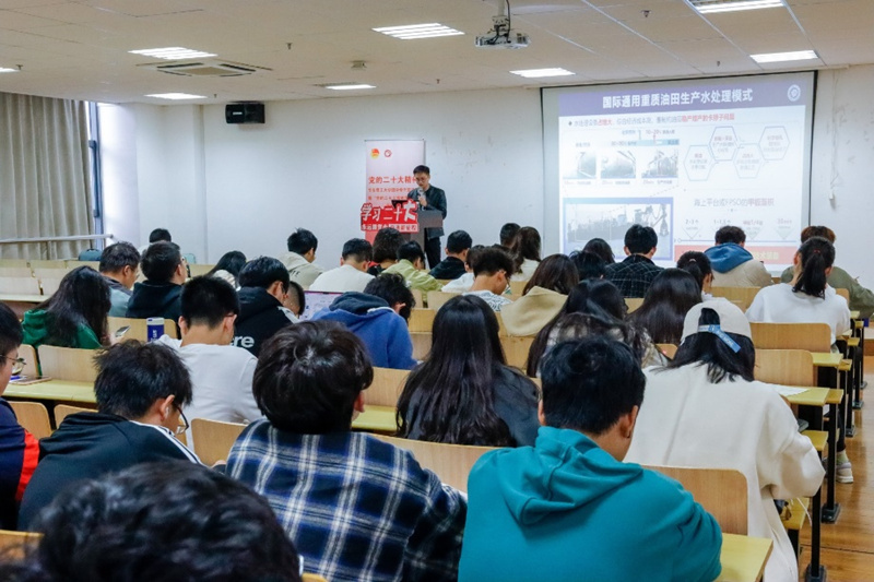 刘懿谦首先带领同学们学习了党的二十大报告中的关于“保护海洋生态环境,加快建设海洋强国”的重要战略部署,结合自己的科学研究及社会实践经历,讲述了在杨强教授的指导下,带领实践团队秉承“十年磨一剑”的精神,勇于攻克海洋油气绿色开采过程中的“卡脖子”技术,持续推动实验室成果转化落地,服务解决海洋油气田生产水处理难题的故事。他结合党的二十大精神、习近平总书记在庆祝建团100周年上的重要讲话精神,以新工科改革建设为契机,围绕加快建设海洋强国的重大战略需求,以所在科研和实践团队在南海Y13-1和渤海CFD-11-2等平台项目中负责油、气、水的高效分离为例,详细介绍了海洋油气资源开采的方式,并分享了基于调研实践中发现的生产废水处理难题,在杨强教授的指导下,和团队一起进行了单纤维流动捕获、亲疏水组合纤维破乳除油、成套技术装备的构建等系统研究,开展“深耕蓝色海疆 助力美丽中国”科研服务实践,与“深海一号”开展庆祝华理建校70周年党建共建活动等,致力于解决困扰我国海洋开采废水处理中的重要难题,培养新时代蔚蓝力量。