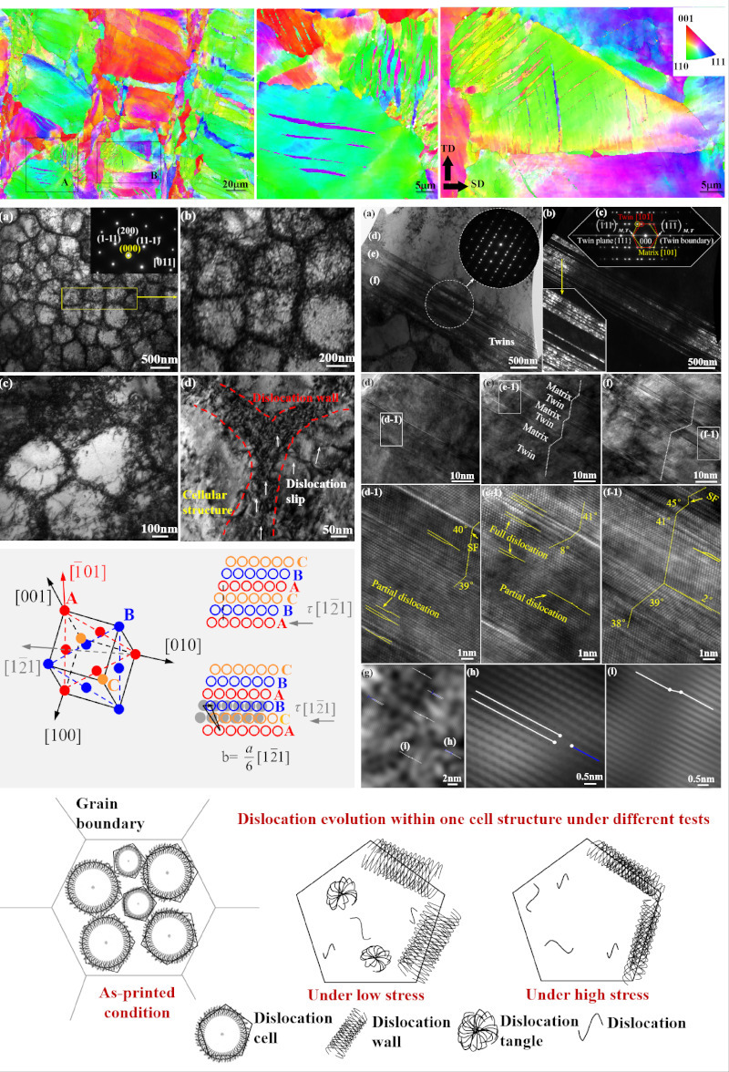 近日,yl88858cc永利官网的硕士研究生陈亦楠围绕L-PBF增材制造面心立方晶体(FCC)结构的CoCrFeNi高熵合金在交变载荷工况下的疲劳行为及损伤演变机制持续深入研究;发现激光快速非平衡熔凝的CoCrFeNi微观结构含有高密度的小角度晶界、异常显著的晶内胞状亚结构和原子堆垛层错特征,促使在较低应力水平的交变应力下诱发大量纳米孪晶,建立和阐明了上述因素交互作用的物理机制模型;探明了在L-PBF增材制造CoCrFeNi疲劳行为中的位错胞(Dislocation cells)演变过程及其与晶内胞状亚结构(Cellular structures)的交互作用机理,位错受胞壁结构(Cellular walls)阻碍、在一定范围往复移动导致位错湮灭、解离和重排,位错重排则倾向于形成较低能量构型,即具有交替高-低密度位错区域的新型位错胞壁(Dislocation cell-walls),这不仅改善了高周疲劳性能,同时能阻碍位错的大范围移动,为反应生成纳米孪晶提供了更大可能;此外,通过施密特因子计算及相同尺寸、不同取向的晶粒内部诱发孪晶比例量化对照,意外发现L-PBF增材制造FCC系列HEAs纳米孪晶更易在<110>取向的晶粒内部产生,这可为通过L-PBF激光工艺改变微观晶粒取向分布、实现构-性精准调控和强韧取向性的人工设计,提供新的可行路径。