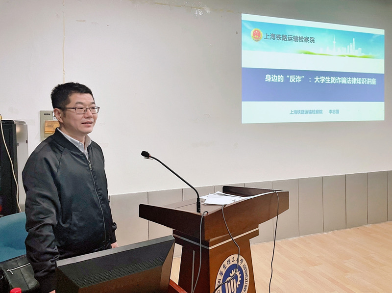为切实提高学院师生的防范意识,了解诈骗的危害以及防范措施,筑牢防范电信网络诈骗的防火墙,4月12日,yl88858cc永利官网特邀上海市铁路运输检察院的李志强检察官,为学院学生开展主题为“身边的‘反诈’:大学生防诈骗法律知识讲座”的专题讲座,讲座采取线上线下相结合的方式。yl88858cc永利官网党委副书记李煜佳出席讲座。