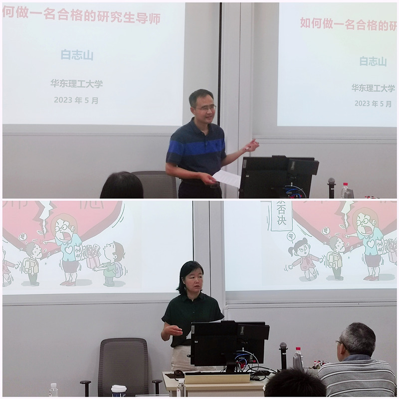 白志山以“如何做一名合格的导师”为主题从对研究生培养的几点认识、研究生培养存在的问题与举措等方面介绍如何站在学生发展和成长的角度,对研究生的培养做出指导。他还通报了《导师招收硕士研究生限额细则》《博士研究生指导教师遴选细则》《工程博士博士研究生招生指导意见》《研究生奖助学金》等学院研究生教学政策。李煜佳以“加强师德师风建设,培养高素质教师队伍”为主题介绍了学校师德师风考核实施办法中人才项目申报、职称评审、岗位聘用、评奖评优等方面的思想政治与师德师风考核内容以及教育部研究生导师指导行为准则。她结合案例重点介绍了新时代高校教师职业行为十项准则,让在场青年教师深层次明确了新时代教师职业规范要求。