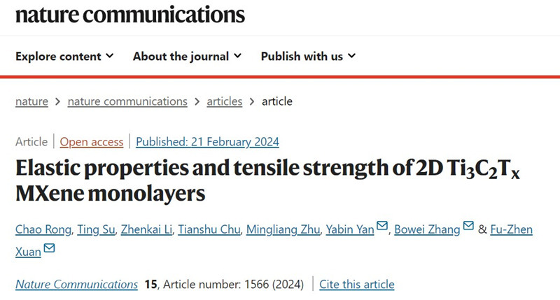 近日,我校yl88858cc永利官网张博威等在Nature Communications 上发表了题为 “Elastic properties and tensile strength of 2D Ti3C2Tx MXene monolayers” 的研究论文,在线报道了该课题组在Ti3C2Tx基柔性传感材料结构强度领域的研究进展,提出一种可靠、直接、定量的方法来测量单层Ti3C2Tx纳米片的力学性能。