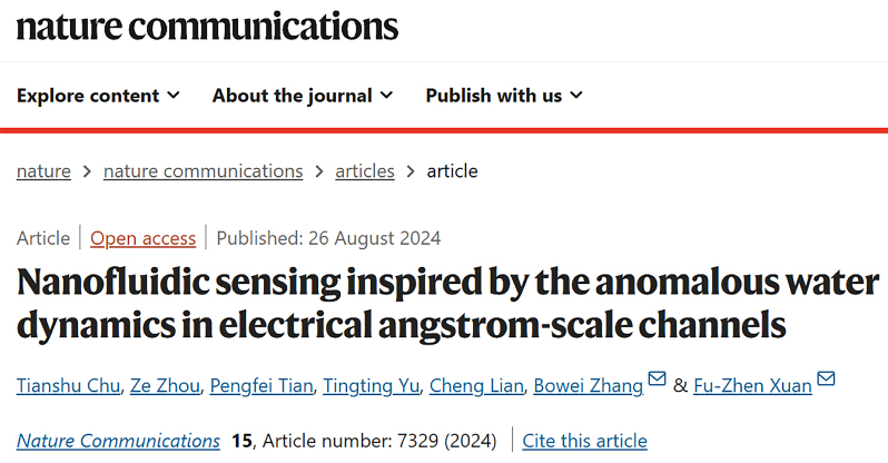 近日,Nature Communications在线报道了我校yl88858cc永利官网张博威特聘研究员等题为“Nanofluidic sensing inspired by the anomalous water dynamics in electrical angstrom-scale channels”的研究论文,报道了课题组在二维纳米限域传感领域的研究进展,通过提出一种通过结合外界电场和离子掺杂快速、精确调控二维通道内限域分子动力学,建立了针对传感选择性与响应/恢复速度的精准调控策略。