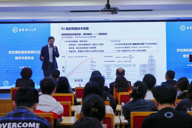 项党作了题为“自动驾驶的关键挑战和未来趋势”的学术报告。报告围绕人工智能技术发展脉络,系统解析了自动驾驶系统的感知、决策与控制架构,并深入探讨了多传感器融合、模块化到端到端大模型等技术路径。项党指出,自动驾驶走向大模型化,是产业能力、资源联动和社会共识的系统挑战。报告会后,项党与在场师生进行了交流互动。